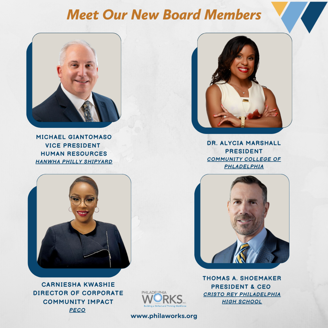 Philadelphia Works, Inc. (PhilaWorks), the city’s workforce development board and a leader in innovative workforce solutions, is proud to announce the appointment of four distinguished leaders to its Board of Directors: Dr. Alycia Marshall, President of the Community College of Philadelphia; Michael Giantomaso, Vice President of Human Resources at Hanwha Philly Shipyard, Inc.; Thomas A. Shoemaker, President & CEO of Cristo Rey Philadelphia High School; and Carniesha Kwashie, Director of Corporate Community Impact at PECO, Pennsylvania’s largest electric and natural gas utility.